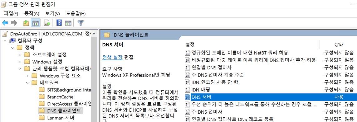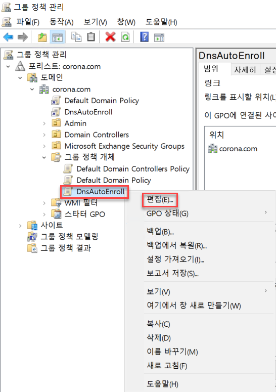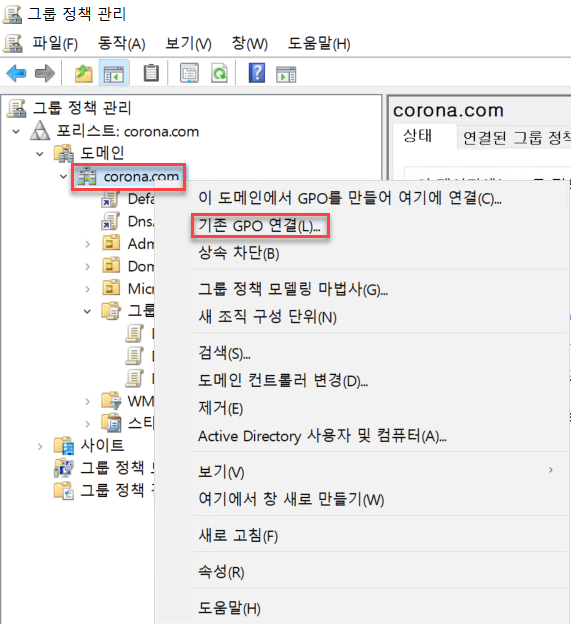 >> 그룹 정책을 적용시킬 도메인 우클릭 후 위에서 생성한 그룹 정책 개체 연결