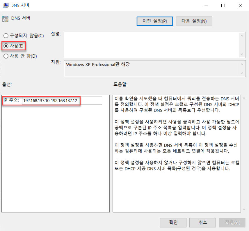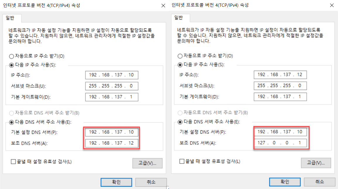 >> AD1 : 192.168.137.10(왼쪽)과 AD2 : 192,168.137.12(오른쪽)에 적용된 DNS서버의 IP주소