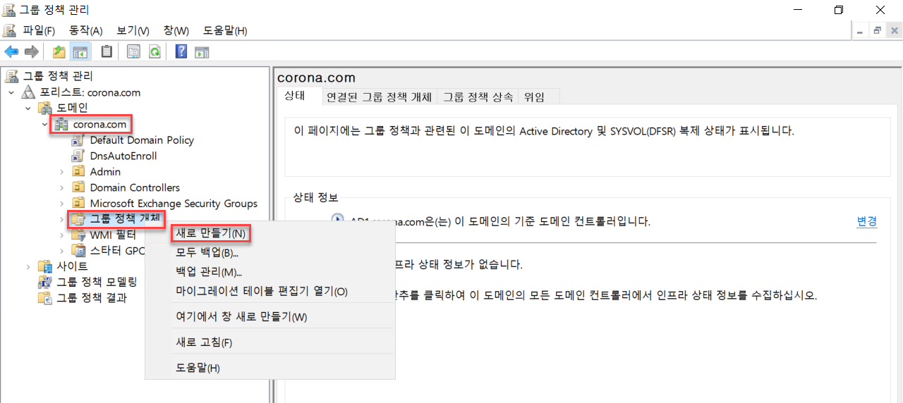 >> 도메인 >> 그룹 정책 관리 >> 그룹정책 개체 우클릭 >> 새로 만들기