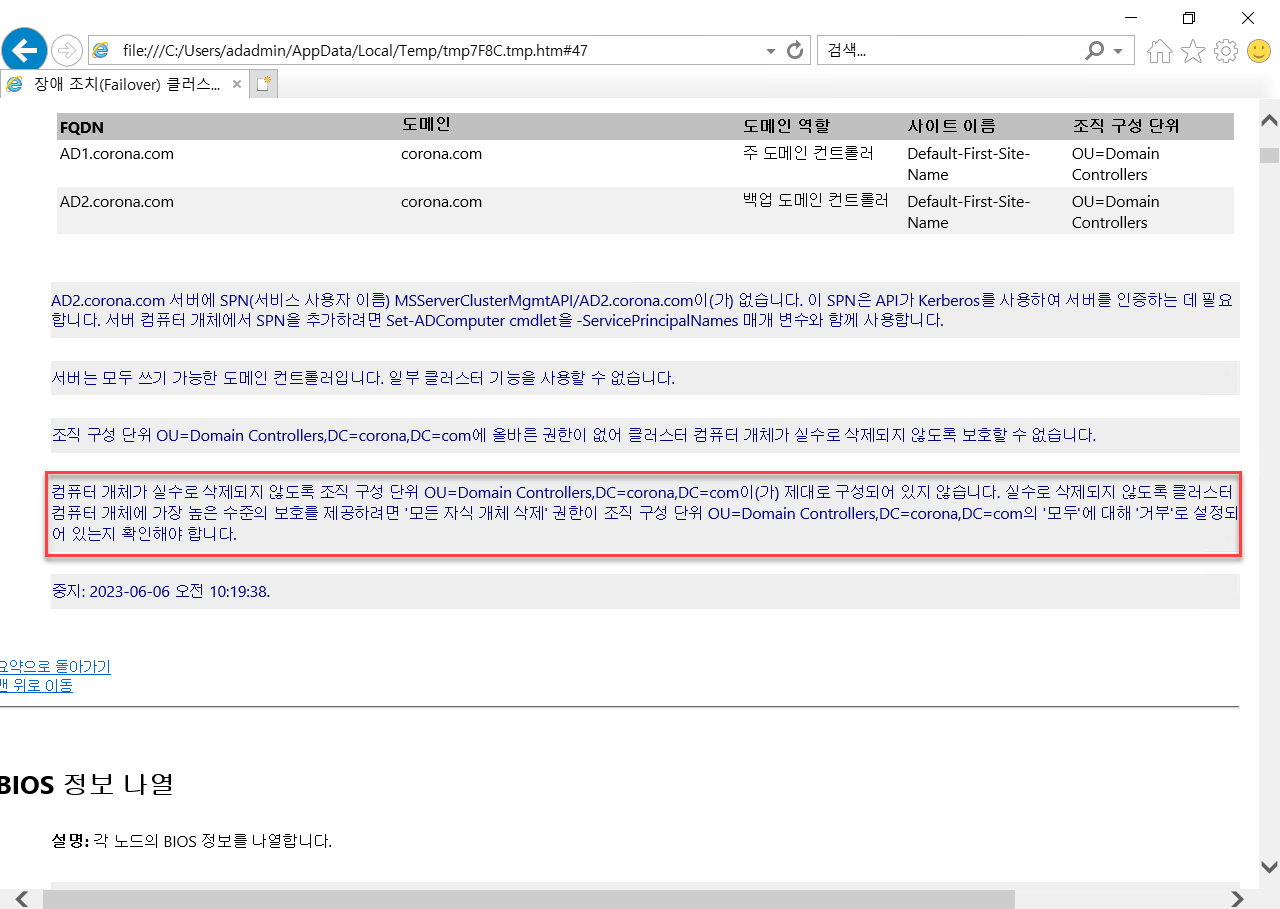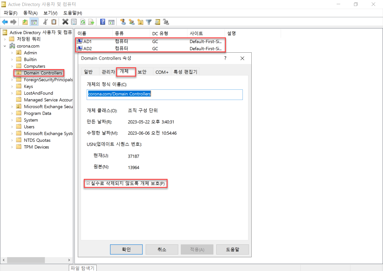 AD사용자 및 컴퓨터에서 해당 OU 및 하위 서버개체에 대한 개체 보호 설정