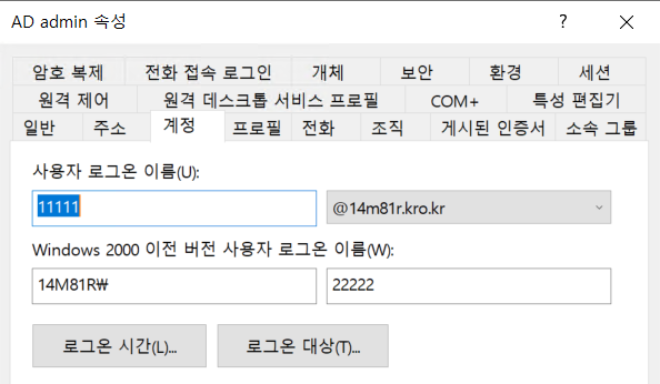 - Windows 2000 이전 버전 사용자 로그온 이름 : SamAccountName