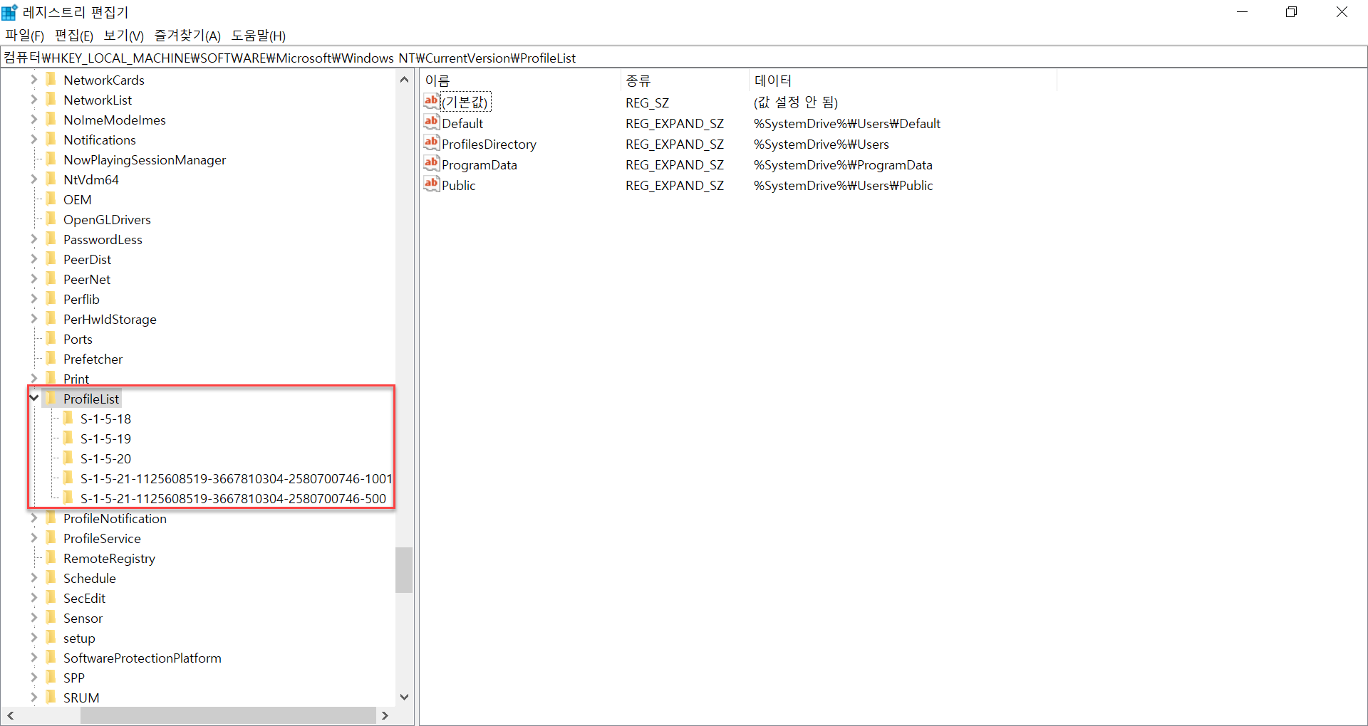 but 사용자프로필을 삭제해도 사용자프로필레지스트리값이 지워지지 않는 경우도 있으니 아래 레지스트리에서 해당계정이 지워졌는지 확인해야함.