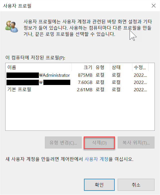 - 기본3개는 지우지 말것, ProfileImagePath에서 계정이름확인 후 삭제