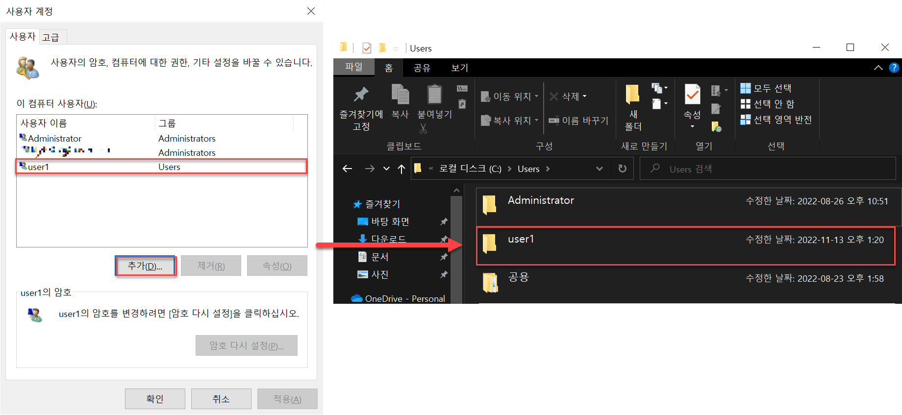 → user1계정으로 로그인하면 C:\Users폴더에 user1폴더가 생긴것 확인.