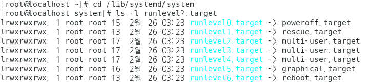 7개의 runlevel?.target파일은 링크파일이다. 각 링크 파일은 실제 파일과 연결되어 있다.